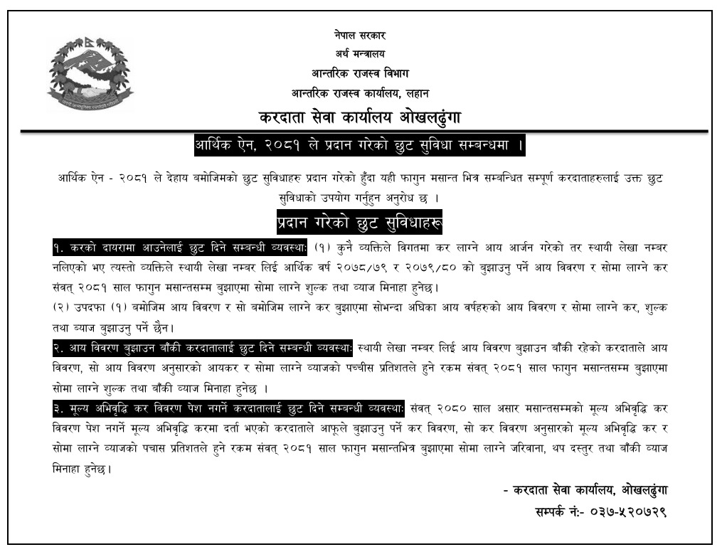 करदाता सेवा कार्यालय ओखलढुंगाकाे अनुराेध !