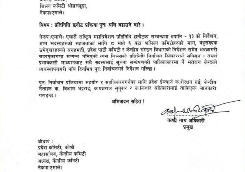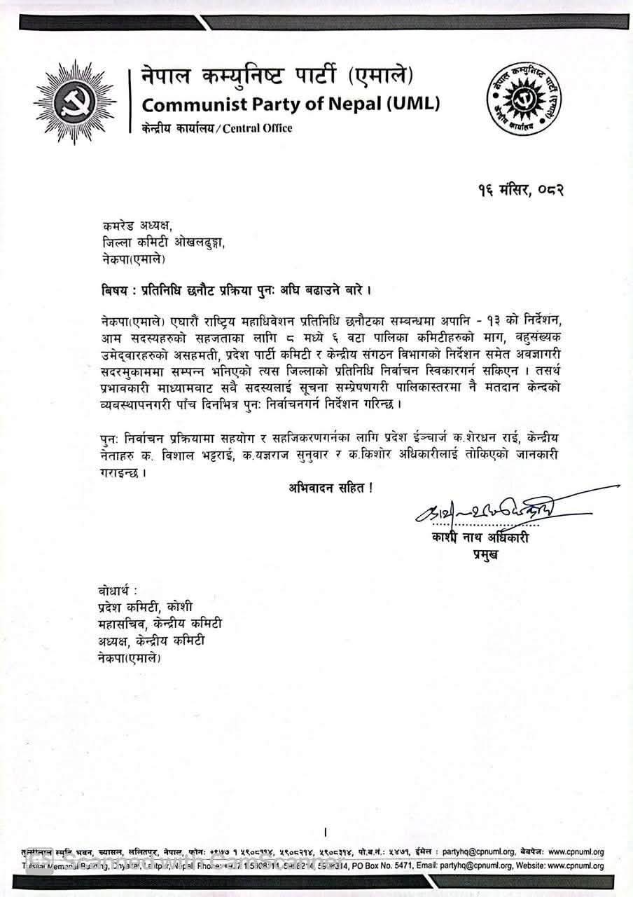 ओखलढुंगा- एमालेले महाधिवेशन प्रतिनिधी छान्न मंसिर १३ गते ओखलढुंगामा गरेकाे निवार्चनलाई केन्द्रीय संगठन विभागले बदर गरेकाे छ । 'प्रदेश केन्द्रकाे निर्देशन र स्थानीय कमिटीहरुकाे माग विपरित सदरमुकाममा सम्पन्न भएकाे भनिएकाे निर्वाचन स्वीकार गर्न सकिएन' संगठन विभागले लेखेकाे पत्रमा भनिएकाे छ [...]