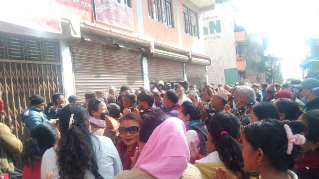 जिल्ला कमिटी बैठकको तयारीका लागि परामर्श बैठक बसीरहेका बेला आक्रोसित समुहले ताला लगाएको हो । ताला लगाएपछि नेताहरु कार्यालय भित्रै थुनिएका छन् । बैठकको तयारी भइरहँदा आफुँहरुसहित केन्द्र र प्रदेशका नेताहरु भित्रै थुनिएको एमाले जिल्ला उपाध्यक्ष कमल न्यौपानेले बताए । सहजिकरणको काम भइरहेको र समाधान आउने पनि उनले बताए ।