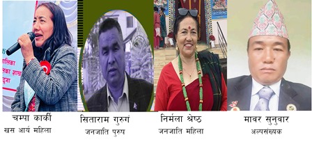 समानुपतिक खस आर्य महिला तर्फ चम्पा कर्की, जनजाति पुरुषतर्फ सिताराम गुरुङ, जनजाति महिला तर्फ निर्मला श्रेष्ठ र अल्पसंख्यक तर्फ मावर सुनुवार छन् ।
